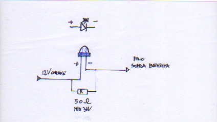 il led avrà un gambo lungo e corto come nel disegno, a quello lungo colleghi il 12V positivo mentre a quello corto il filo della sonda benzina.