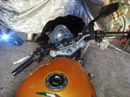 allora la moto è del 2000 ha circa 33000 km,gomme metzeller con meno di 1000 km,scarico leo vince II,con tanto di certificato di omologazione,kit tubi in treccia(ant e post),kit carburazione dinojet stage 1,filtro K&N,batteria messa da un mese,parafango posteriore,puntale mai montato,specchietti Koso,contrappesi carbon look....vendo a 1500 euro,consegna a mano....