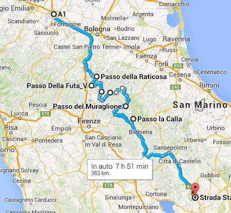 pensavo di fare autostrada A1 fino a Bologna circa, poi lì devo assolutamente fare i passi mitici che mi mancano...futa, raticosa, muraglione ecc...poi magari riprendere autostrada più giù