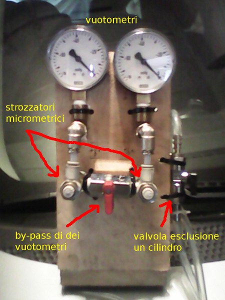 A questo punto collego i due tubi alle prese di depressione, apro il by-pass ed escludo un cilindro.