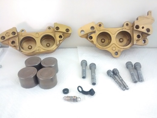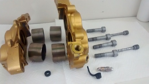 nel frattempo tutto riassemblato e pronto al montaggio (pinze, pastiglie e adattatori)