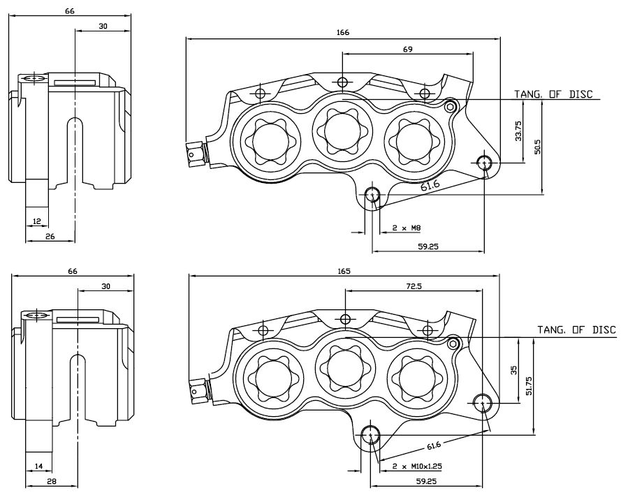 Ho controllato sui disegni tecnici della ISR, dove ho trovato le quote della stessa pinza, in versione CBR (la mia) e in versione GSXR/SV.