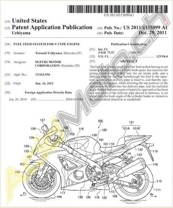 La voci non sono certo campate per aria. Documenti USA datati 29 dicembre 2011 mostrano, di fatto, che è in corso uno studio per adattare il bicilindrico all’interno di una “cornice” GSX-R 1000. Forse ispirati e sconvolti dalle prestazioni raggiunte dalla Ducati Panigale 1199, pare che i tecnici Suzuki vogliano riportare alla luce il buon vecchio v-twin, ovviamente con le opportune modifiche, supportato da una ciclistica e un telaio di razza.