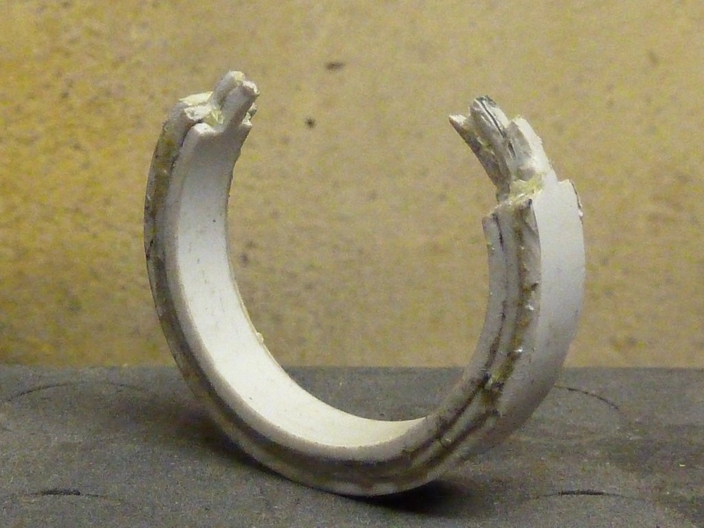 Appoggiando l’anello ad un tubo limate gli scalini per rendere la rampa il più possibile continua, procedete poco alla volta, e rifinite con la tela abrasiva. Eventuali trucioli possono essere rimossi usando della tela più fine.